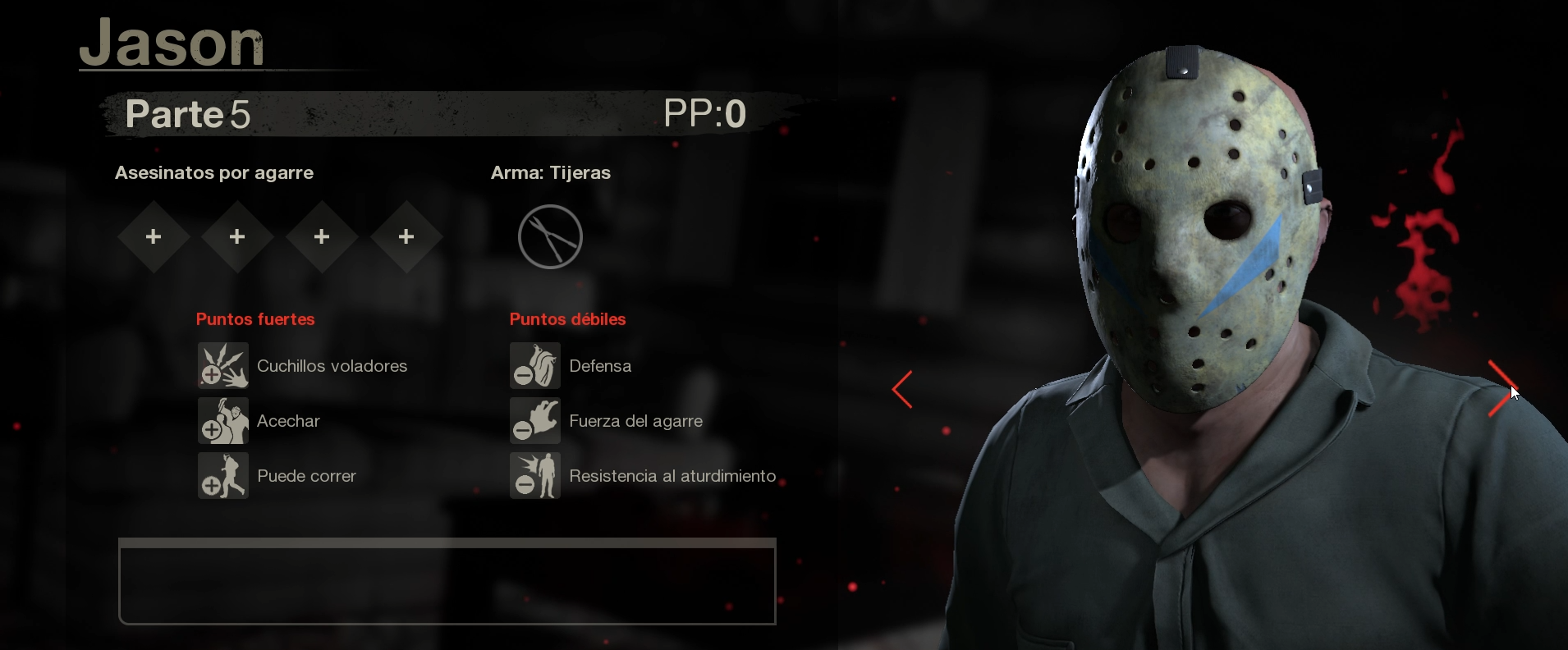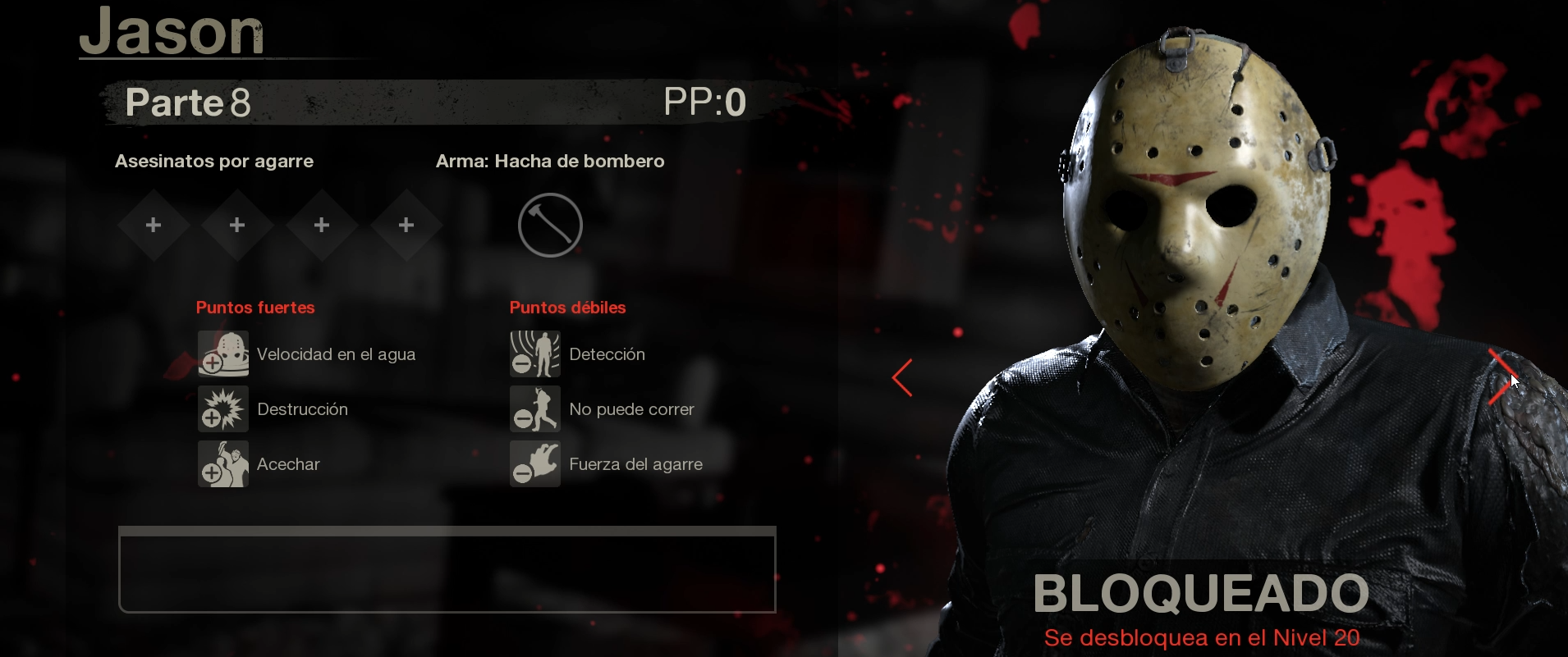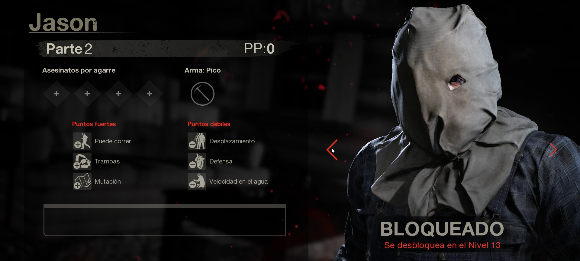 En el videojuego Friday the 13th nos pone en la piel del famoso asesino sin corazón Jason Voorhees o en los extravagantes campistas del lago de cristal. Si en una partida eres Jason gozaras de poderes únicos que el asesino utiliza para cazar a sus víctimas algunas de estos poderes son poder teletransportarte por todo el mapa en busca de campistas y poder avanzar agilmente cuando los estas persiguiendo para poder darles toda clase de muertes horripilantes, aclaramos que el videojuego cuenta con todos los Jason que ha habido a lo largo de las películas y cada uno de ellos cuenta con sus propias armas y habilidades.